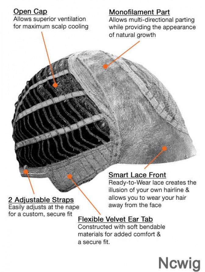 To ensure that the wig is airy, the main BODY of this wig is OPEN WEFTED. This means that the hair has been stitched by machine onto very thin strips of elasticized material. This design ensures that the wig is cool, lightweight & flexible.