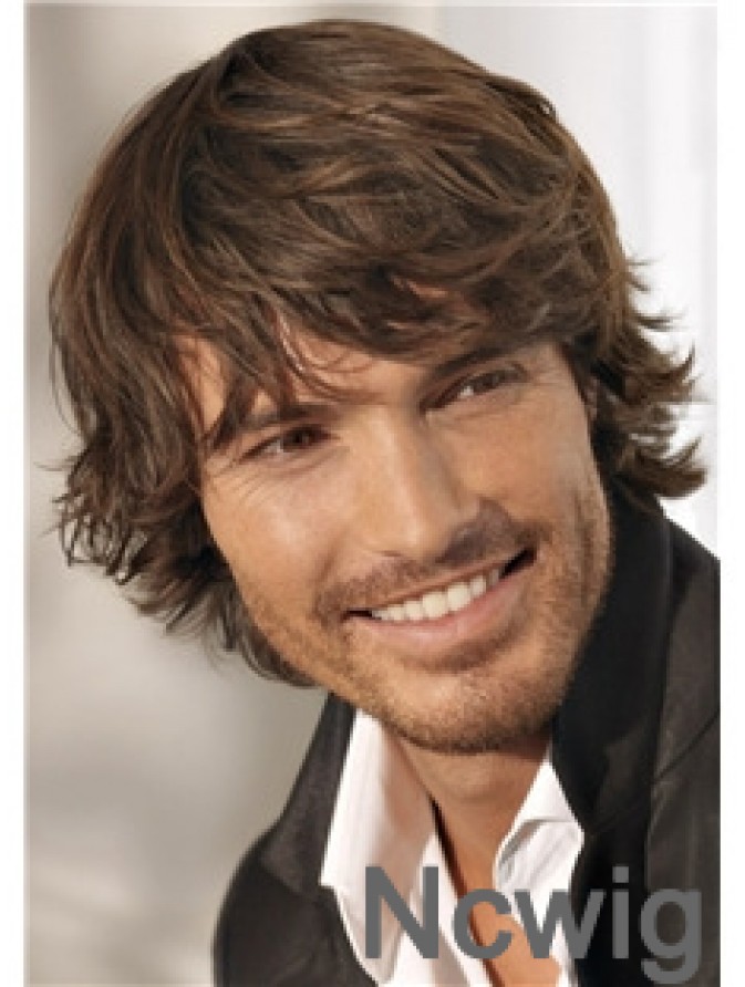 Brown Remy Human Short Wavy Monofilam Cheap Wigs For Men